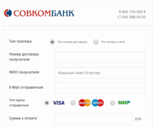 - Перечисление средств на счет в Совкомбанке по номеру счета или по номеру договора. Для осуществления операции достаточно внести реквизиты получателя и сумму взноса. Средства зачисляются в течение 5 рабочих дней.