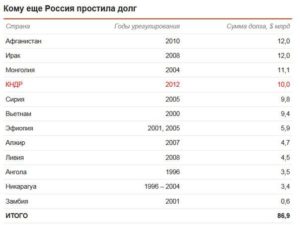Итак, за время своего существования Россия простила долги следующим странам, представленным в таблице ниже. Ознакомьтесь с этими данными.